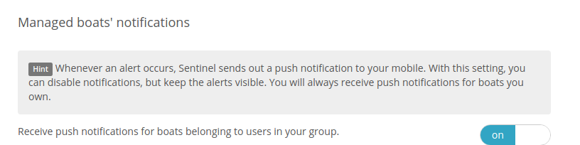 The supervisor user can manage multiple bases and oversee hundreds of boats. If the supervisor uses the Sentinel mobile application to monitor their combined fleet, they may be overwhelmed by push notifications for alerts. If so, the supervisor can disable push notification for himself in the "User Management" section of the web application, as shown below. This does not affect his/her ability to see boats alerts, only the push notification.